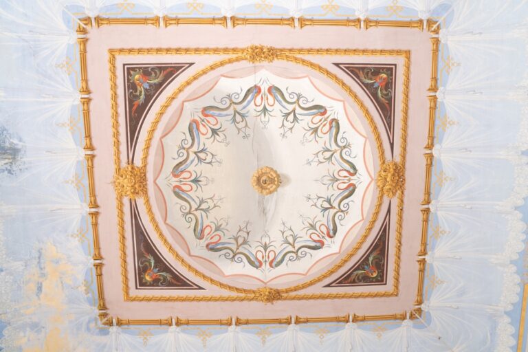 The wallpaper has undergone non-invasive consolidation, allowing its atmosphere and beauty to be enjoyed despite the understandable wear of time. The vaulted ceiling is decorated with love themes such as the quiver and bow joined by a laurel wreath, symbolizing a wish for eternal happiness.