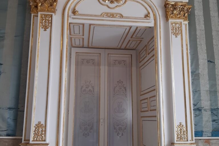The only hall not part of the enfilade, it is accessed directly from the Hall of Mirrors. It preserves a precious 18th-century damask wallpaper, along with two exquisitely crafted gold-laminated doors.