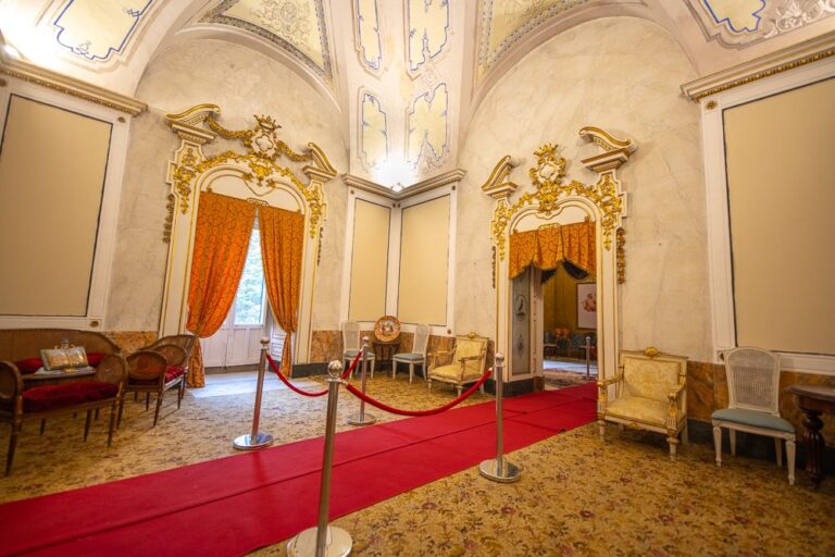 A testament to the purest Art Nouveau style in the ribbon decor of the dome and the owners’ love for France, it features a perfectly preserved marble-effect plaster that extends above the “wainscoting” framing the perimeter of the hall at one meter above the floor, which is covered by a precious Aubusson carpet, custom ordered for this hall. In this hall, the host’s guests would gather to play cards.